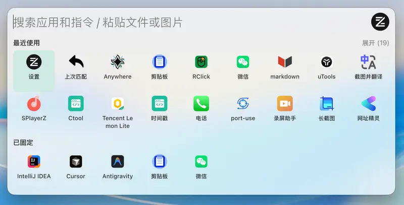 - 搜索:直接输入应用名 (如 "Chrome") 或命令 (如 "翻译 hello")。