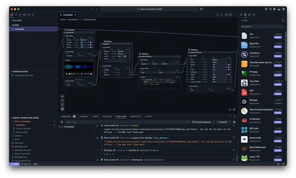 OOMOL Studio 是一款基于 VSCode 打造的现代化集成开发环境(IDE),专为开发者设计,通过整合容器化、AI 功能和社区资源,极大地简化了开发者的日常工作流程。它支持 Windows 和 macOS 两大主流平台,帮助开发者专注于代码本身,而非繁琐的环境配置和调试。