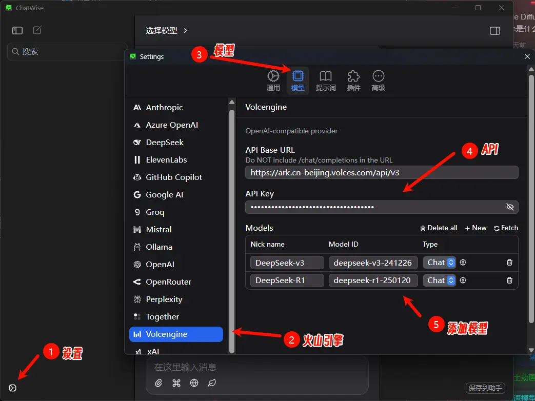 ChatWise通过API兼容多种主流大语言模型,包括GPT-4、Claude、Gemini等,用户可以根据需求灵活选择。(点击查看如何获取API)