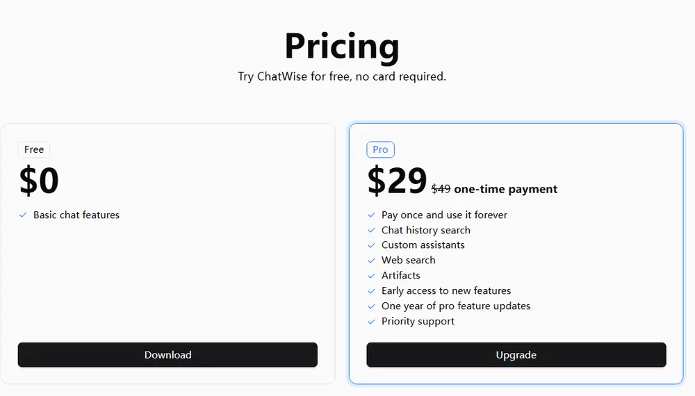 ChatWise的基础功能免费,高级功能需要付费。高级版售价29美元,提供以下额外功能: