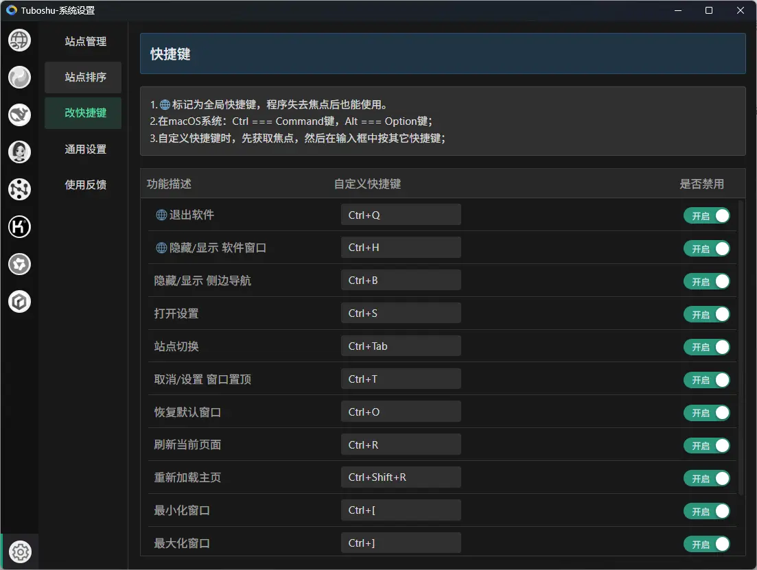 Tuboshu支持高度自定义,用户可以根据个人喜好调整窗口尺寸、应用图标、快捷键,并且可以注入JavaScript脚本和自定义CSS样式,打造专属的页面。