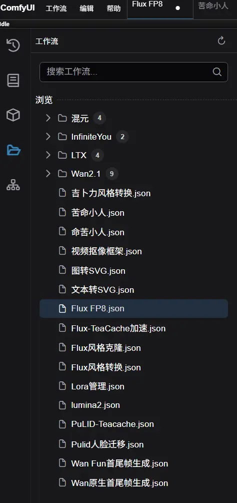 - 加载:导入“.json”或拖入生成图像(含工作流信息)。