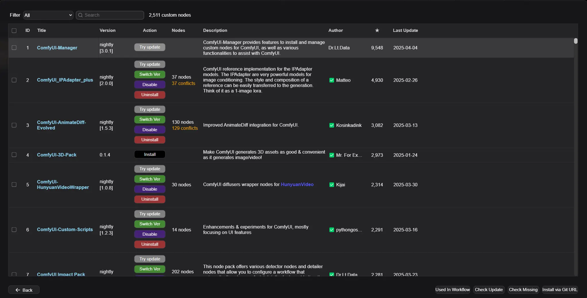 | ComfyUI-Manager | 一个强大的节点管理器,用于管理自定义节点 | 安装、移除、禁用和启用自定义节点,更新 ComfyUI,安装缺失节点 |