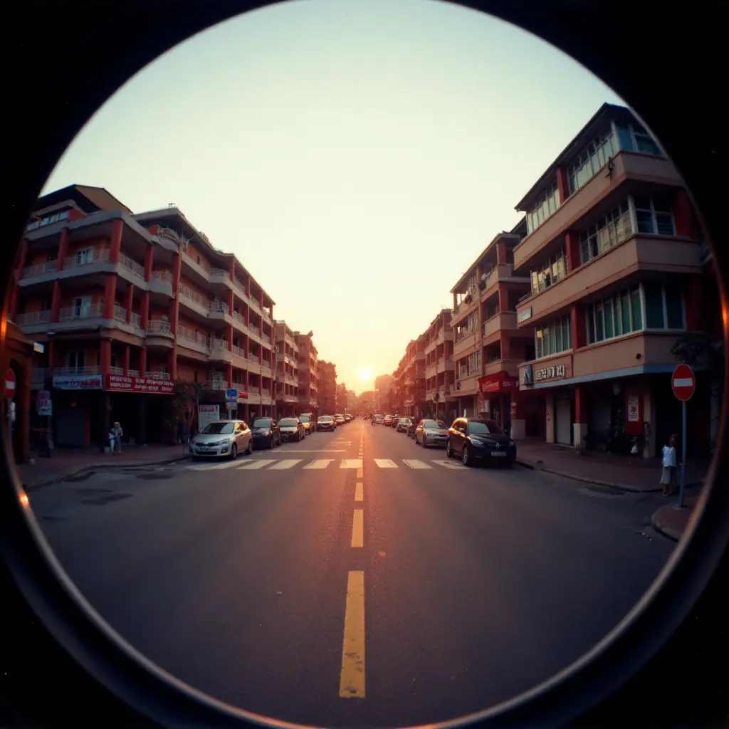 Grainy film fisheye lomography,A bustling city street scene captured in the early morning light. The wide-angle fisheye effect captures the entire street, including the distorted buildings and the vibrant colors of the sunrise. The image has a nostalgic lomography feel, with slight vignetting and grainy texture, reminiscent of early 2000s film photography