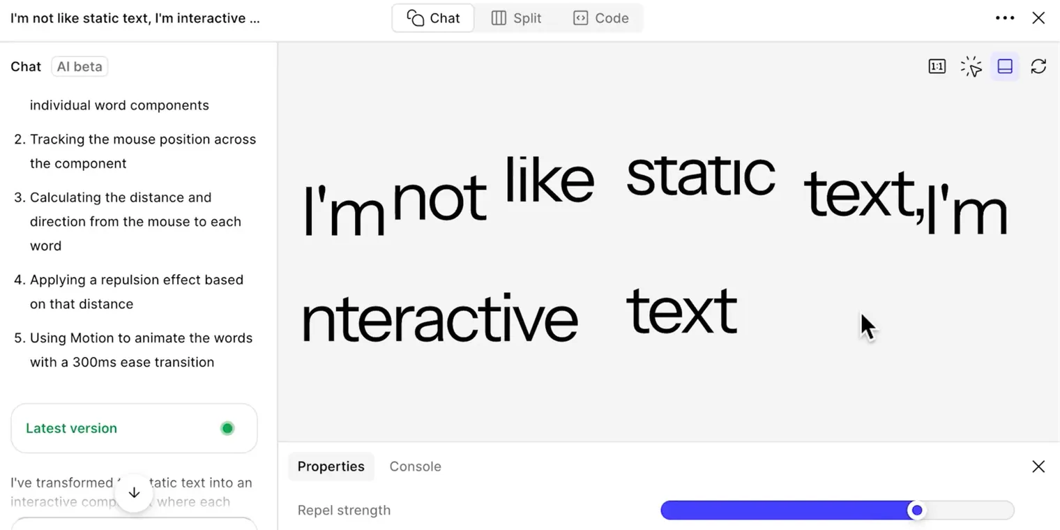 现支持使用代码层,使用户能够为文本添加自定义交互和动画。用户可以自行编写代码或利用Figma的AI辅助生成代码。