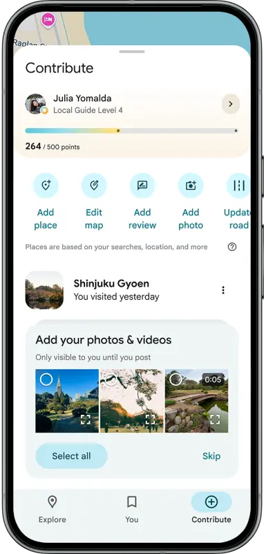 该公司还让用户更容易找到合适的图像与社区分享。如果用户在手机设置中为 Google 地图开启媒体访问权限,他们将直接在“贡献”选项卡中看到来自其近期体验的照片和视频。从那里,他们可以点击一张照片并发布。