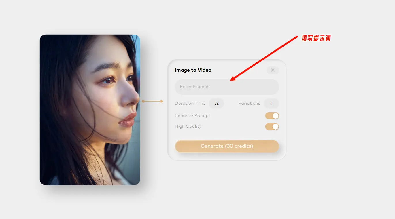 点击图片后面的+后,在图生视频选项框中输入提示词,提示词增强和高品质是自动勾选的