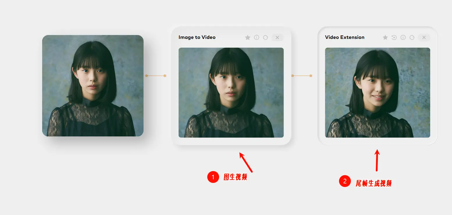 生成视频后,还可以点击+,不过不是以视频生成视频,而是在上一个视频的尾帧基础上进行生成,这样就可以生成一个连贯的长视频