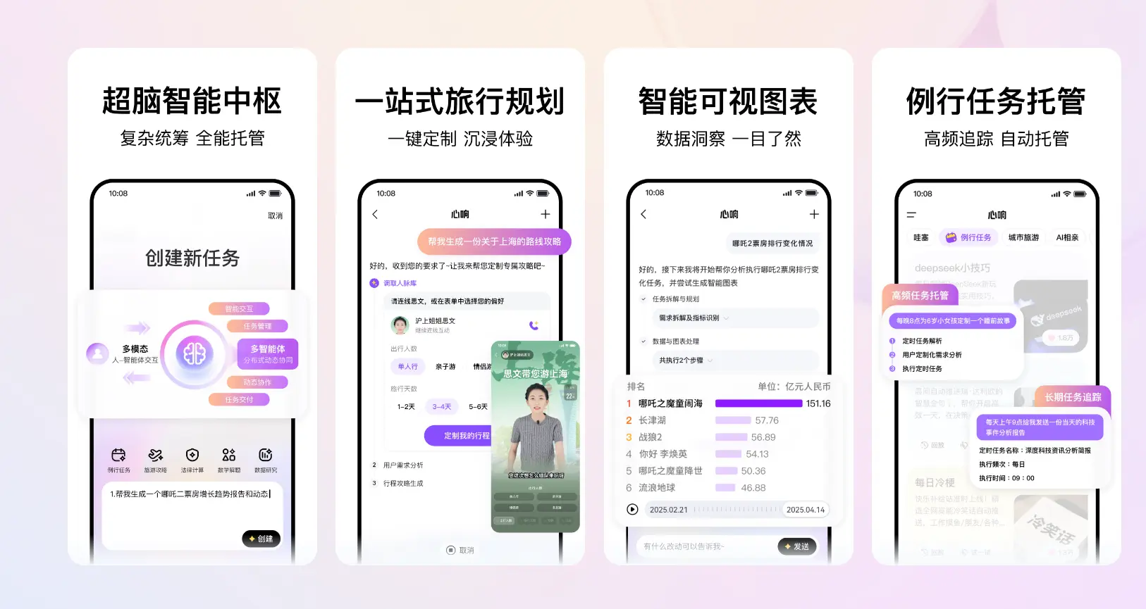 心响 App 的核心技术在于其强大的自然语言理解和任务拆解能力。用户只需用自然语言描述任务需求,系统便会自动将其分解为多个子任务,并动态分配给相应的智能体或工具进行处理。最终,所有结果会被整合并以可视化的方式呈现给用户,确保过程透明且易于理解。