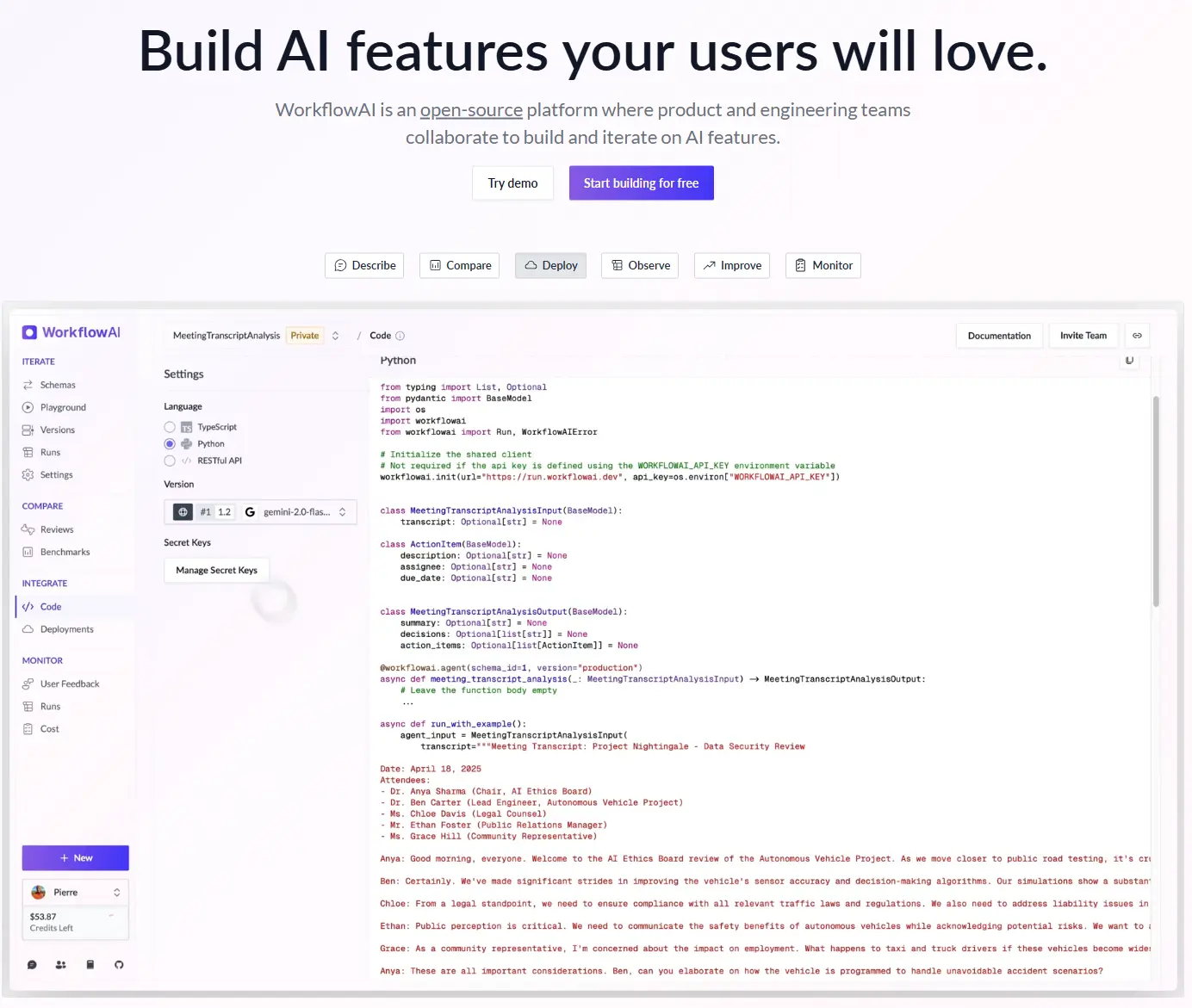 WorkflowAI 的核心目标是简化 AI 集成过程,使团队能够快速开发 AI 驱动的功能。它既可以用于解锁只有 AI 才能实现的新功能,也可以优化现有流程以节省时间和成本。根据文档,WorkflowAI 提供了一个协作环境,适合产品经理和开发者共同工作。