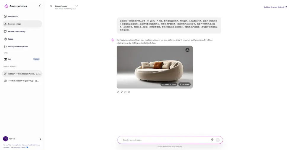 Amazon Nova是亚马逊推出的AI聊天机器人,基于亚马逊推出的Nova系列模型,供开发者和技术爱好者探索这些模型。该网站支持尝试免费 AI 功能,如 Amazon Nova Canvas(图像创建和编辑)和 Amazon Nova Sonic(语音对话)。