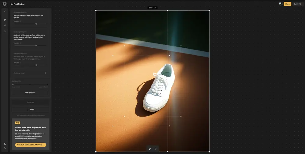 Canvas的AI功能是其最大的创新点之一。用户可以通过文本提示生成图像,或者选择图像的特定区域进行“区域提示”操作。例如,用户可以用文字描述希望改变的部分(如“让背景更明亮”或“增加复古质感”),AI会根据提示重新生成该区域。此外,滑块功能允许用户调整区域提示的权重,生成多种版本以供选择。 - 变体生成