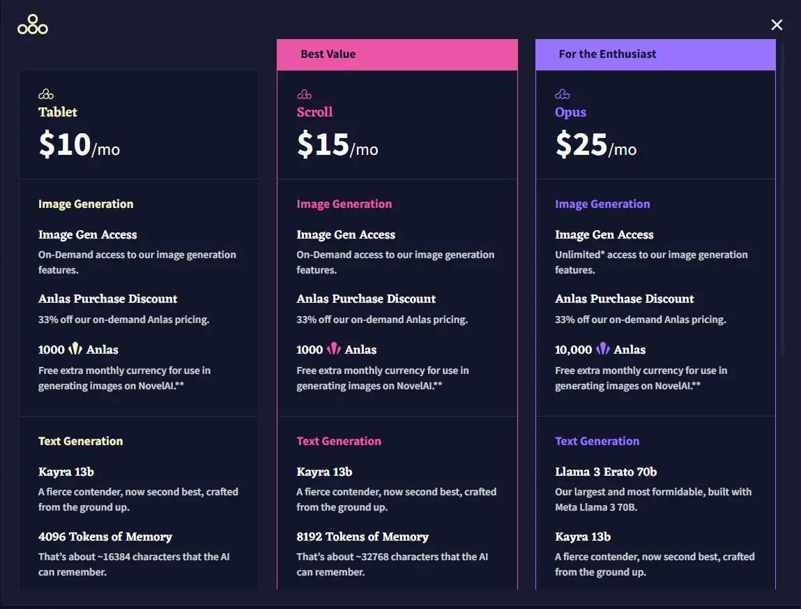 NovelAI 提供多种订阅计划,以满足不同用户的需求: