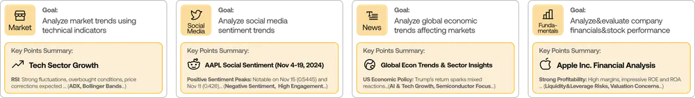 - 基本面分析师:评估企业财务数据、盈利能力、资产负债等指标,识别内在价值和潜在风险。
