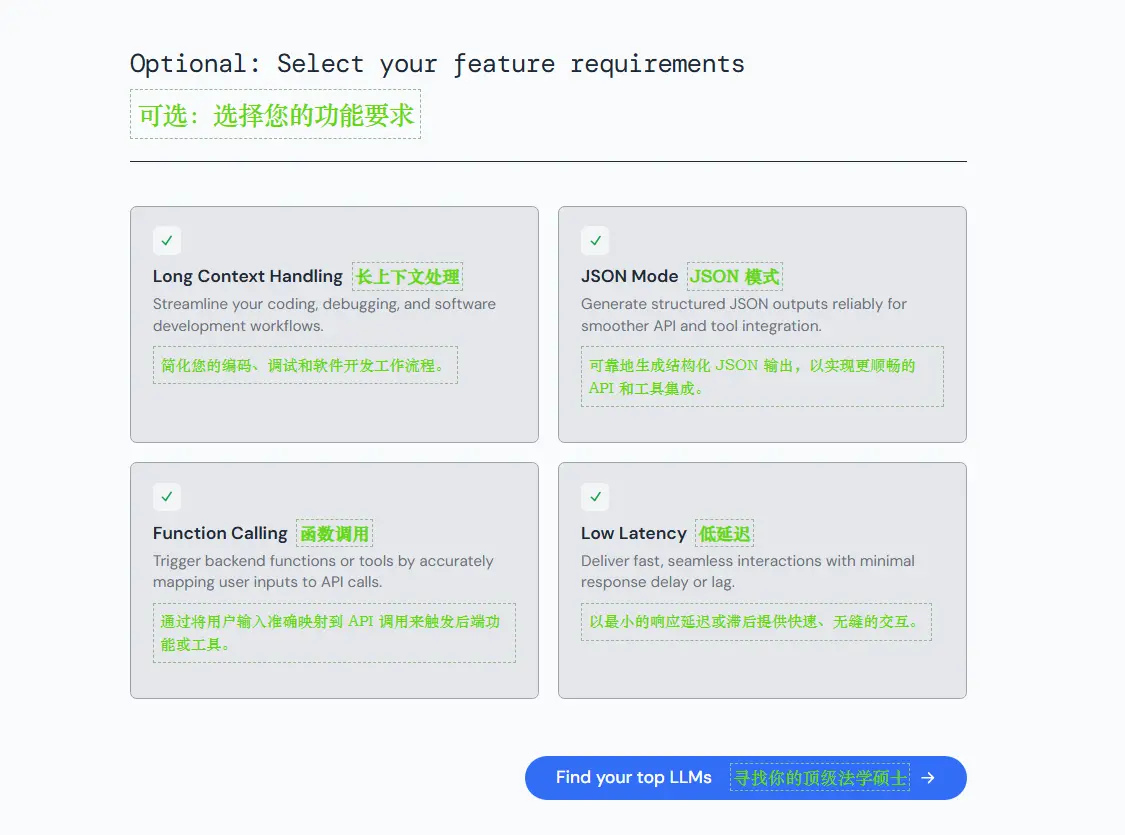 Which LLM是一款免费应用,帮助您选择适合您使用场景的开源大语言模型。您甚至可以根据特定需求进行筛选,例如低延迟或 JSON/工具支持!