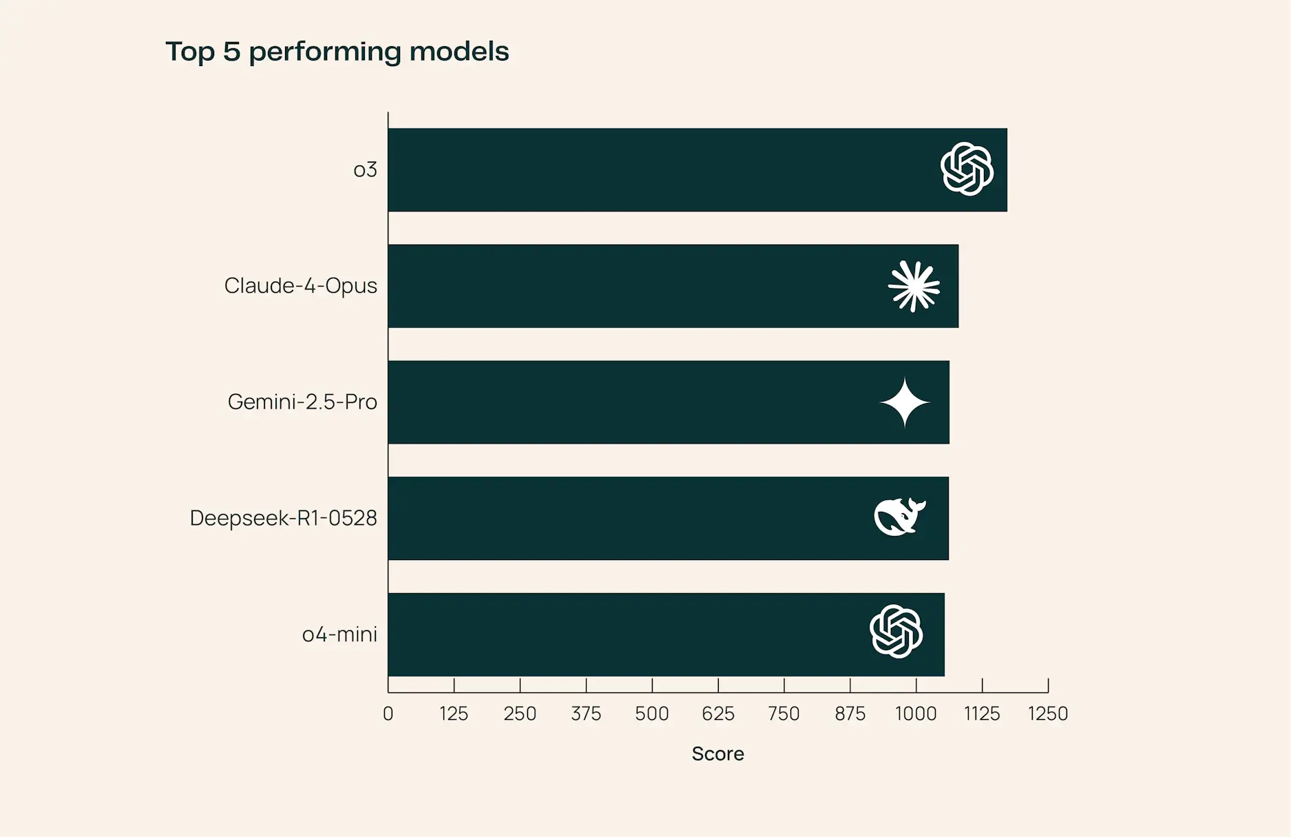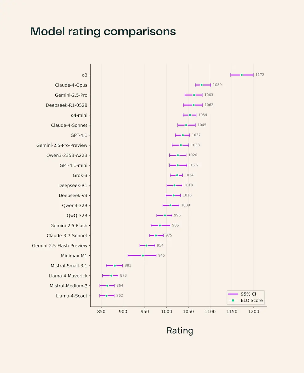 基于社区投票数据,使用 Elo 评分系统对模型进行动态排名,实时反映模型能力变化。
