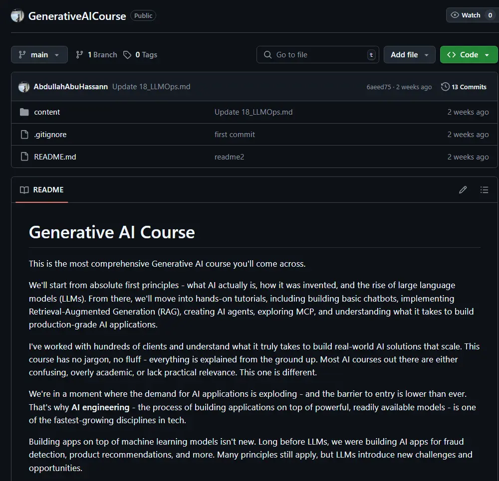 这是一门专为初学者设计的全面而实用的生成式 AI 课程,无论你是刚接触 AI 的开发者,还是希望将 AI 技术应用到实际项目中的工程师,都能从中获得扎实的知识基础和实践能力。