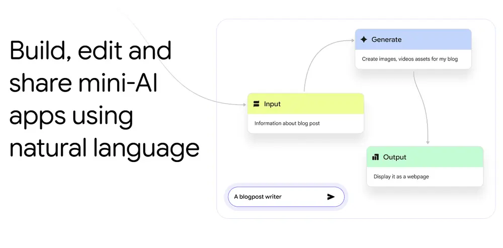 你不需要懂编程,也不必手动拼接 API 或调试模型输出。只要用日常语言描述你想做什么,Opal 就会自动生成一个可视化的流程图,把你的提示(prompt)、调用的 AI 模型、以及需要使用的工具串联起来,形成一个完整的 AI 工作流。