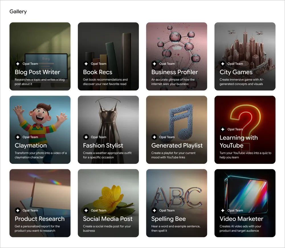 为了帮助你快速入门,Opal 内置了一个模板库,提供多种预设场景: