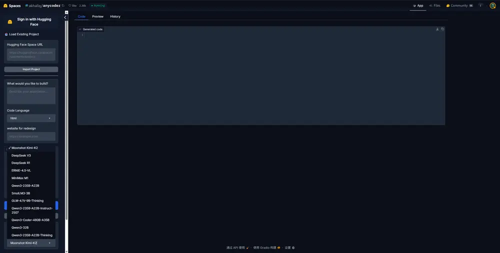 AnyCoder 的最大优势之一是与 Hugging Face 生态的深度集成。