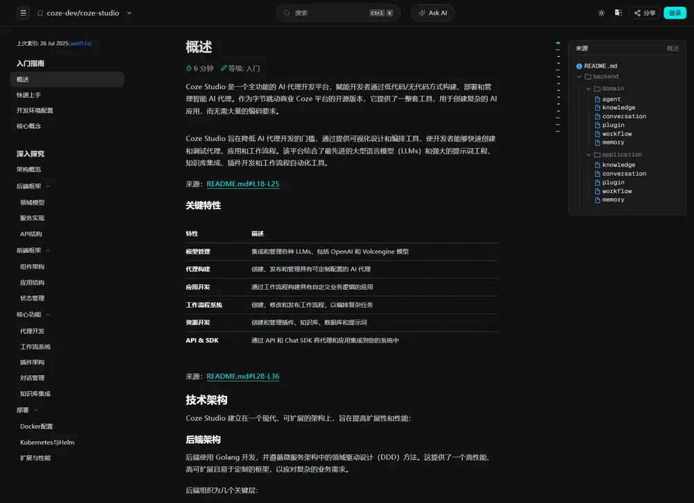 Zread 的一个显著特点是支持中文,这使其区别于类似工具如 Cognition 的 DeepWiki,并更好地满足中文开发者的需求。界面采用清晰直观的双栏布局,右侧目录展示项目结构,左侧内容循序渐进讲解各部分功能,排版上还可能使用图表来增强可读性。此外,Zread 原生支持中文,与 DeepWiki 类似但更适合中文用户。