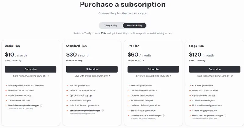 目前需要付费才可以使用,Midjourney有共有 3 种会员,Basic (基本)、Standard (标准)及 Pro (专业),可以选择每月缴费或一次性交一年。