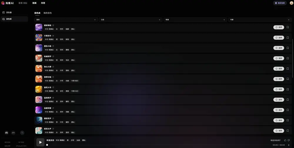 海螺语音不仅具备情感理解能力,能够智能识别并重现语音中的细微情感差别,使声音更加生动、情绪表达更加精准。此外,它还提供了超过300种预置音色供用户选择,涵盖不同的语言、口音、性别和年龄层,风格从不羁、诙谐到慈祥等应有尽有,适用于有声书、ASMR耳语、新闻播报等多种场景。