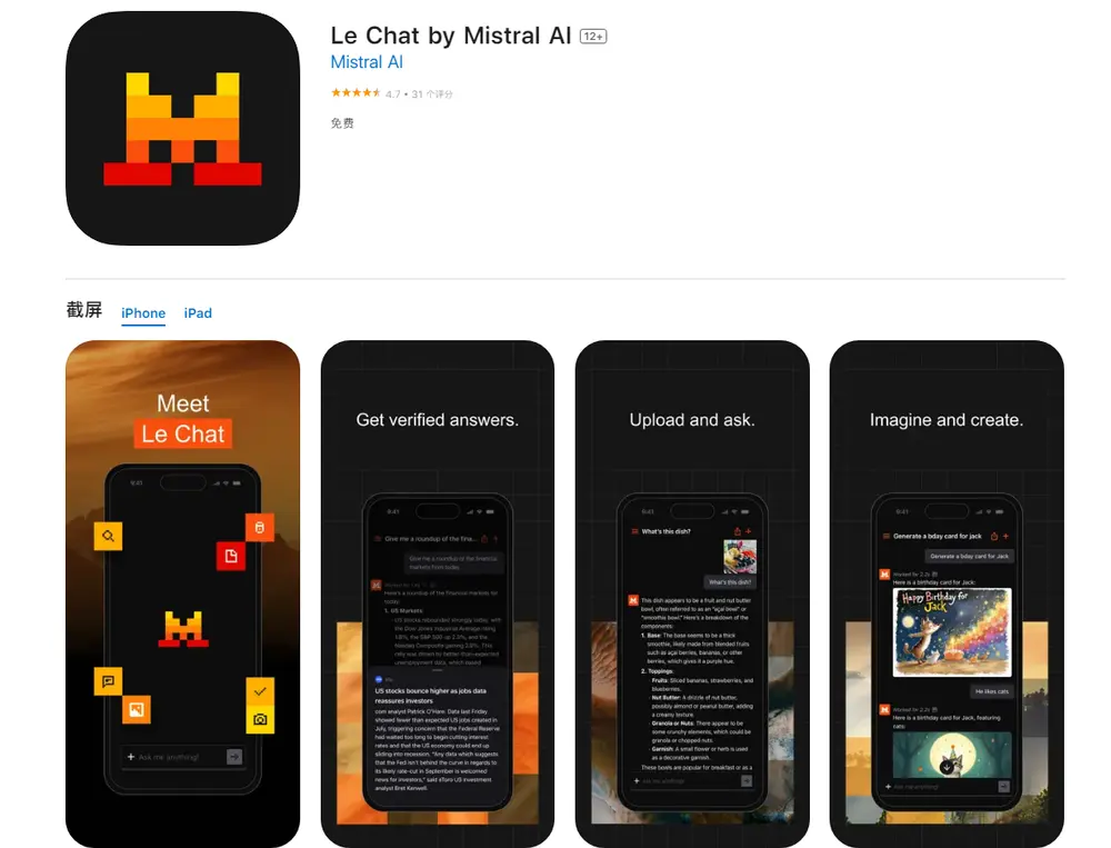 为了更好地争夺手机市场的份额,Mistral 于 2 月 5 日正式发布了 Le Chat 的移动应用程序。这款应用具有直观的聊天机器人界面,支持用户查询 AI 模型并进行后续提问。