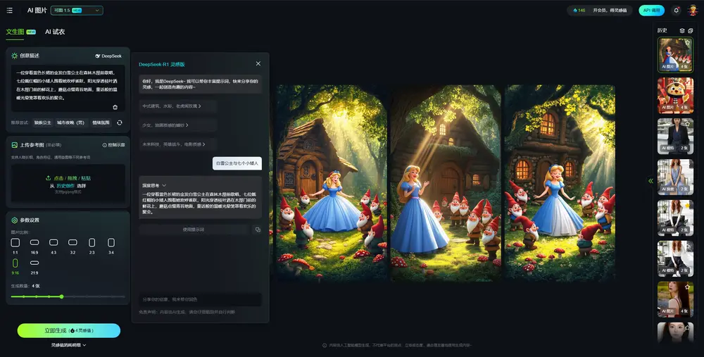 AI 图片生成: 支持文生图和图生图功能,用户基于描述或参考图生成多种尺寸、多种风格的创意图片,效果逼真,色彩丰富,细节精致。 支持将图片一键生成视频,增强内容的动态表现力。