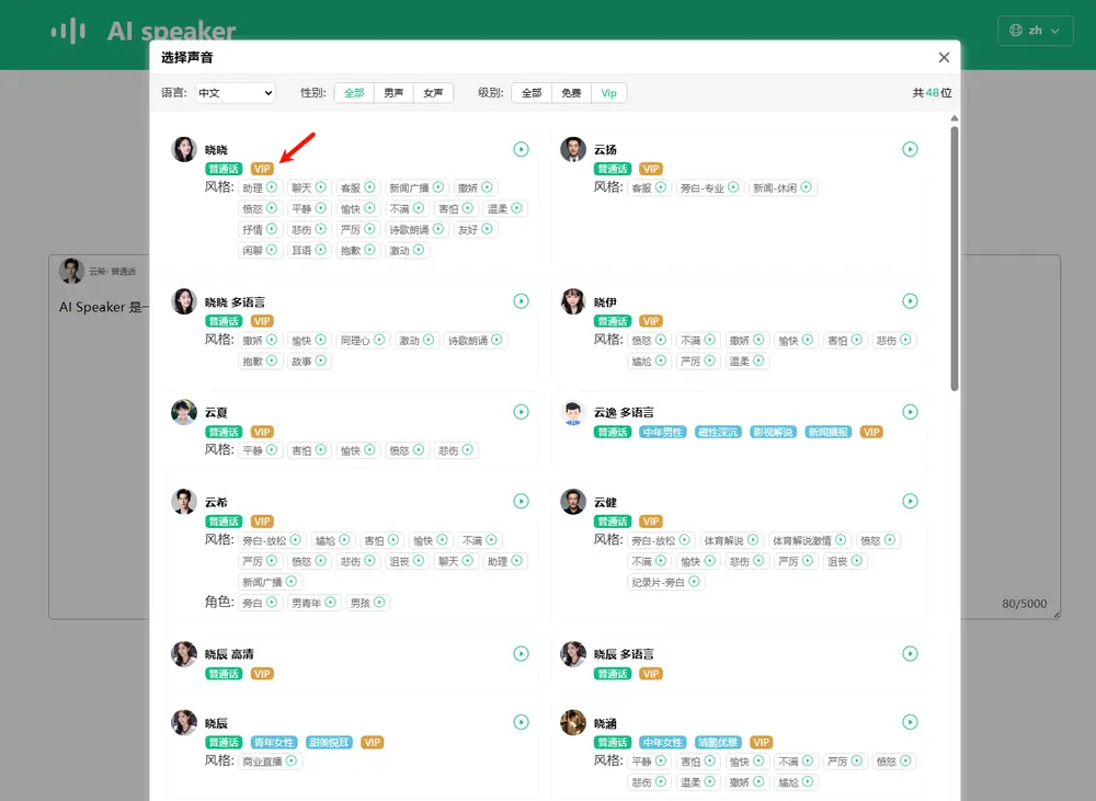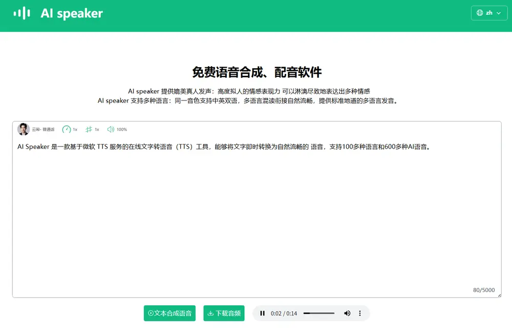 AI Speaker 是一款基于微软TTS 服务的在线文字转语音(TTS)工具,能够将文字即时转换为自然流畅的 语音,支持100多种语言和600多种AI语音。